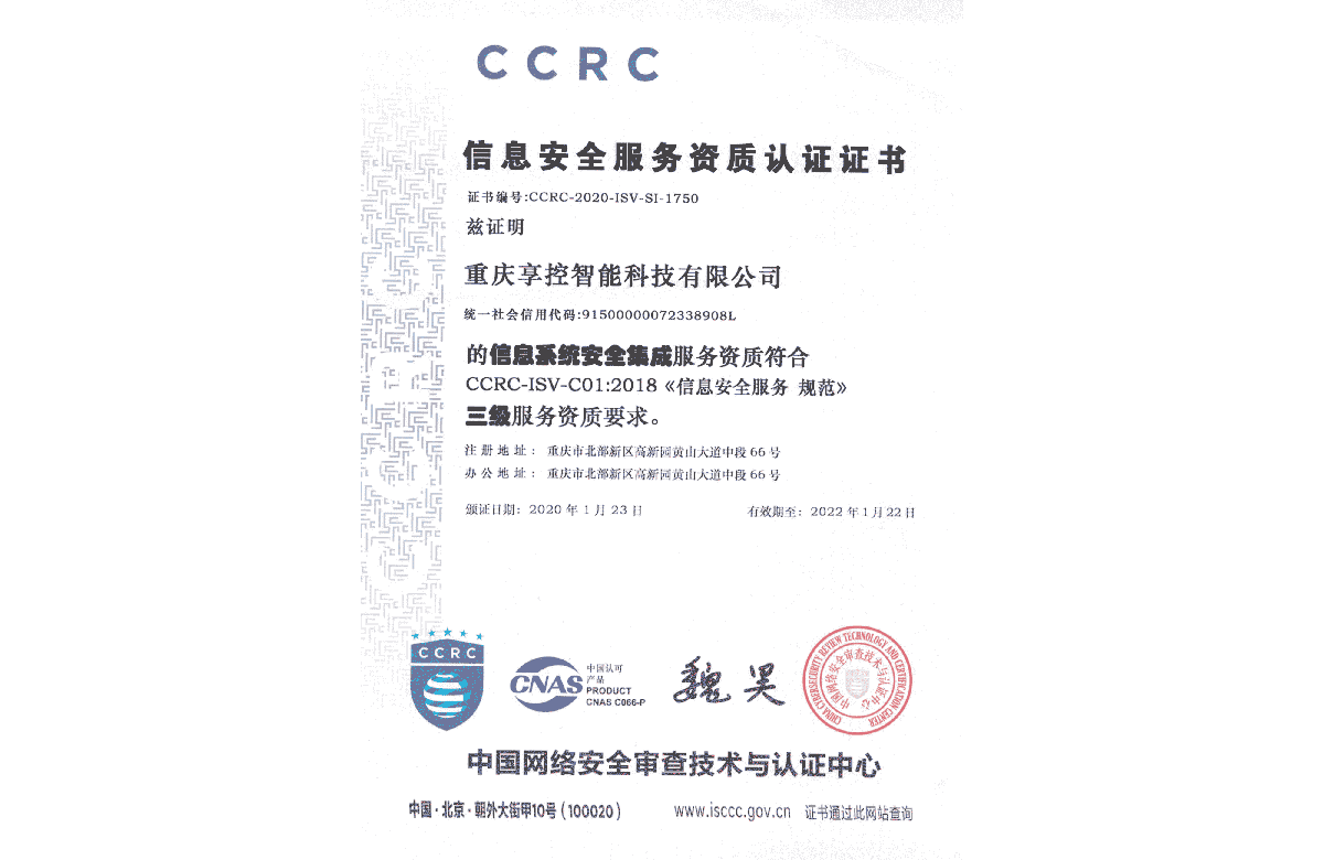 獲信息安全服務體系認證證書