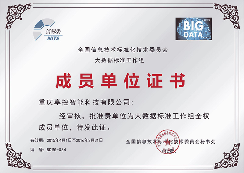 全國信標委批準重慶享控智能科技有限公司為“大數據標準工作組全權成員單位”